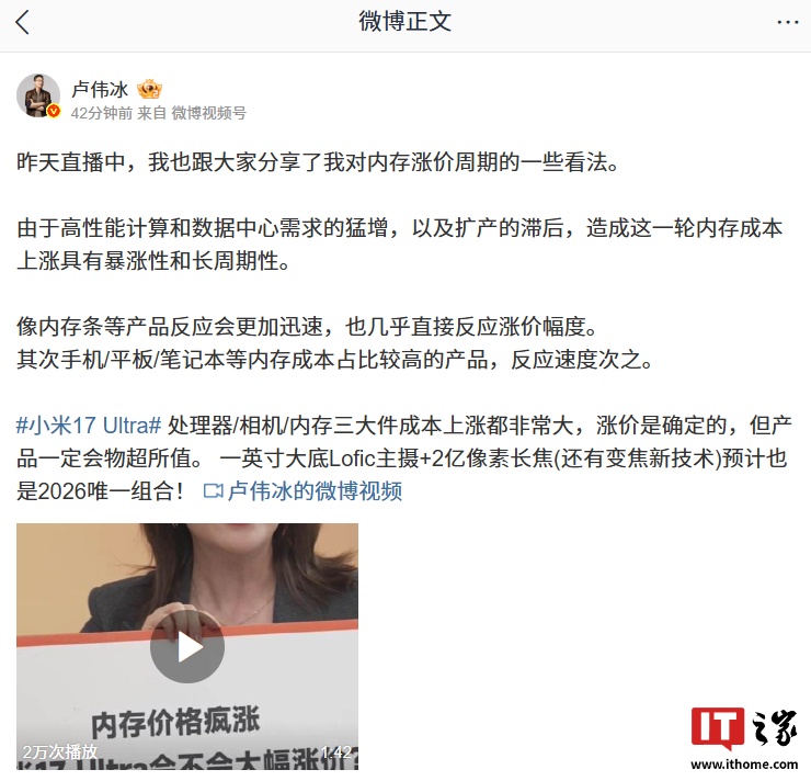 IT之家 12 月 21 日消息,小米集团合伙人、总裁,手机部总裁,小米品牌总经理卢伟冰今日发文回顾了自己昨日在直播中对于内存涨价周期的一些看法。他表示,由于高性能计算和数据中心需求的猛增,以及扩产的滞后,造成这一轮内存成本上涨具有暴涨性和长周期性。